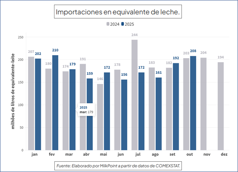 Las importaciones aumentaron aproximadamente un 8,2% en octubre, alcanzando un total de 208,1 millones de litros durante ese período. En comparación con octubre del año anterior, el aumento fue menor, en torno al 2,3 %. Sin embargo, en el período acumulado de enero a octubre de 2025, las importaciones registraron una disminución del 4,1 % con respecto al mismo período de 2024.