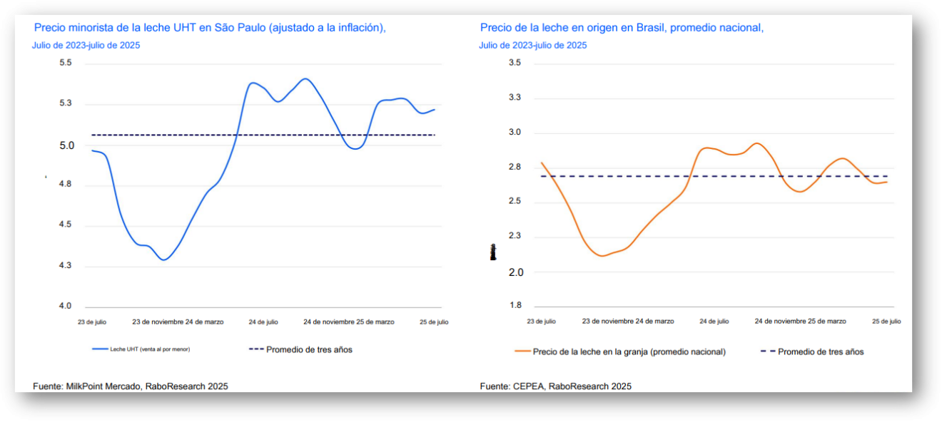 Los precios de la leche experimentaron una moderada disminución ante el aumento de la oferta. Los precios comenzaron a disminuir en el tercer trimestre de 2025, a medida que la oferta aumentó en los principales estados productores. Según CEPEA, el precio promedio de la leche en origen en julio fue de BRL 2,65/litro (US$ 0,549/litro), inferior a los BRL 2,82/litro de abril (US$ 0,552/litro), ajustado a la inflación. A pesar de la tendencia a la baja, los precios se mantienen relativamente respaldados por una demanda mayor de lo esperado.