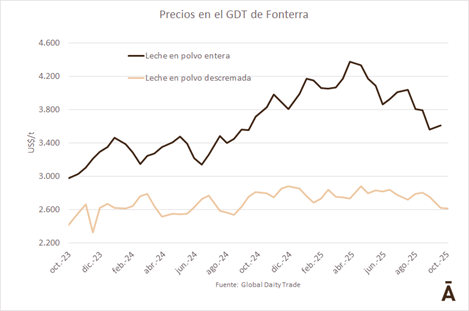 En el caso de la leche en polvo entera, el producto que más pondera en la subasta, el promedio general bajó 2,4% a US$/t 3.610. El ángulo positivo de este remate fue que el contrato más lejano (marzo 2026) fue el que registró el menor descenso porcentual (-1%).