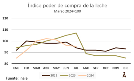 El índice de poder de compra de la leche en pesos, que procesa el Inale, cerró abril con un valor de 107 (marzo 2024=100), un nuevo máximo en lo que va del año e igualando el techo alcanzado en julio de 2023. Respecto a abril del año pasado, el poder de compra de la leche tuvo una mejora 4,6%. El índice de costos de producción de leche en pesos tuvo una suba del 8,6% durante el último año. Sin embargo, esto fue más que compensado por un aumento en el índice del precio de la leche en pesos del 14%.