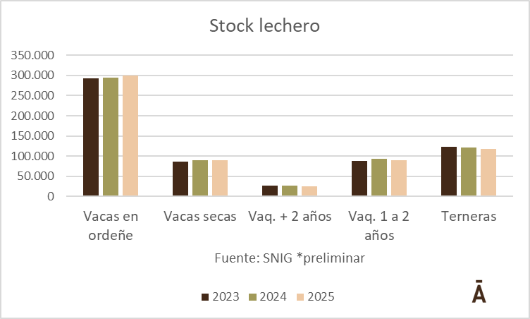 De acuerdo a los datos preliminares que divulgó el SNIG con la Declaración Jurada, al 30 de junio de 2025 el stock de ganado lechero en el país era de unas 677 mil cabezas, en baja de 1% versus el año anterior (-6.845 animales).
