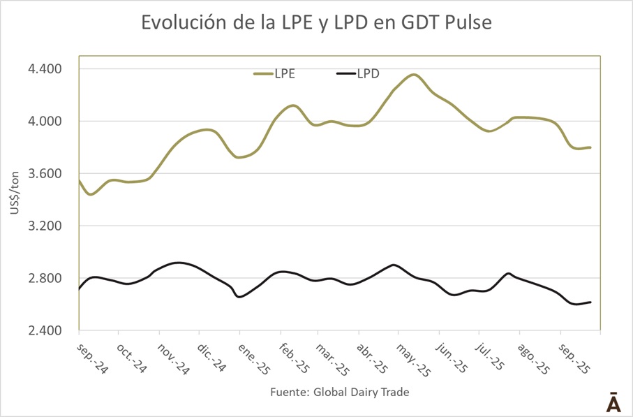 La subasta 90 de Global Dairy Trade (GDT) Pulse, la última del mes de septiembre, volvió a marcar un nuevo descenso en las cotizaciones y cerró el mes acumulando una baja del 5,4% para la leche en polvo entera (LPE) y del 3,8% para la descremada (LPD). En esta oportunidad, con ventas únicamente de Fonterra, la leche en polvo entera (LPE), tanto regular como instantánea, y leche en polvo descremada (LPD) sumaron 2.459 toneladas comercializadas, un 5,3% más que la semana pasada. De LPE se comercializaron 1.405 toneladas, en tanto que de LPD se comercializó 1.054 toneladas.