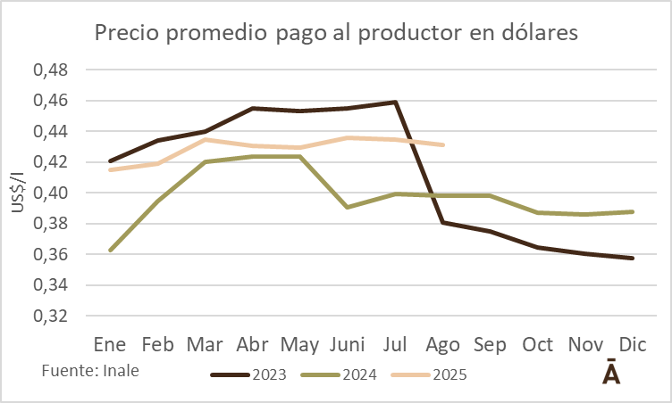De acuerdo a los datos que divulgó el Inale, el precio promedio que pagaron las industrias por la remisión de agosto se ubicó en $ 17,26 por litro versus los $ 17,49 de julio (-1,4%). En tanto, en dólares el valor medio se ubicó en US$ 0,43 por litro, en baja de 0,3% versus el mes anterior.