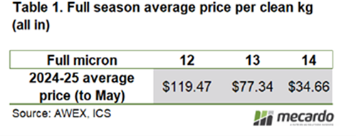 El precio promedio alcanzado fue de US$ 119 por kilo base limpia, aproximadamente un 50% más que la lana de 13 micrones, cuyo valor medio duplicó a su vez al de la lana de 14 micras.