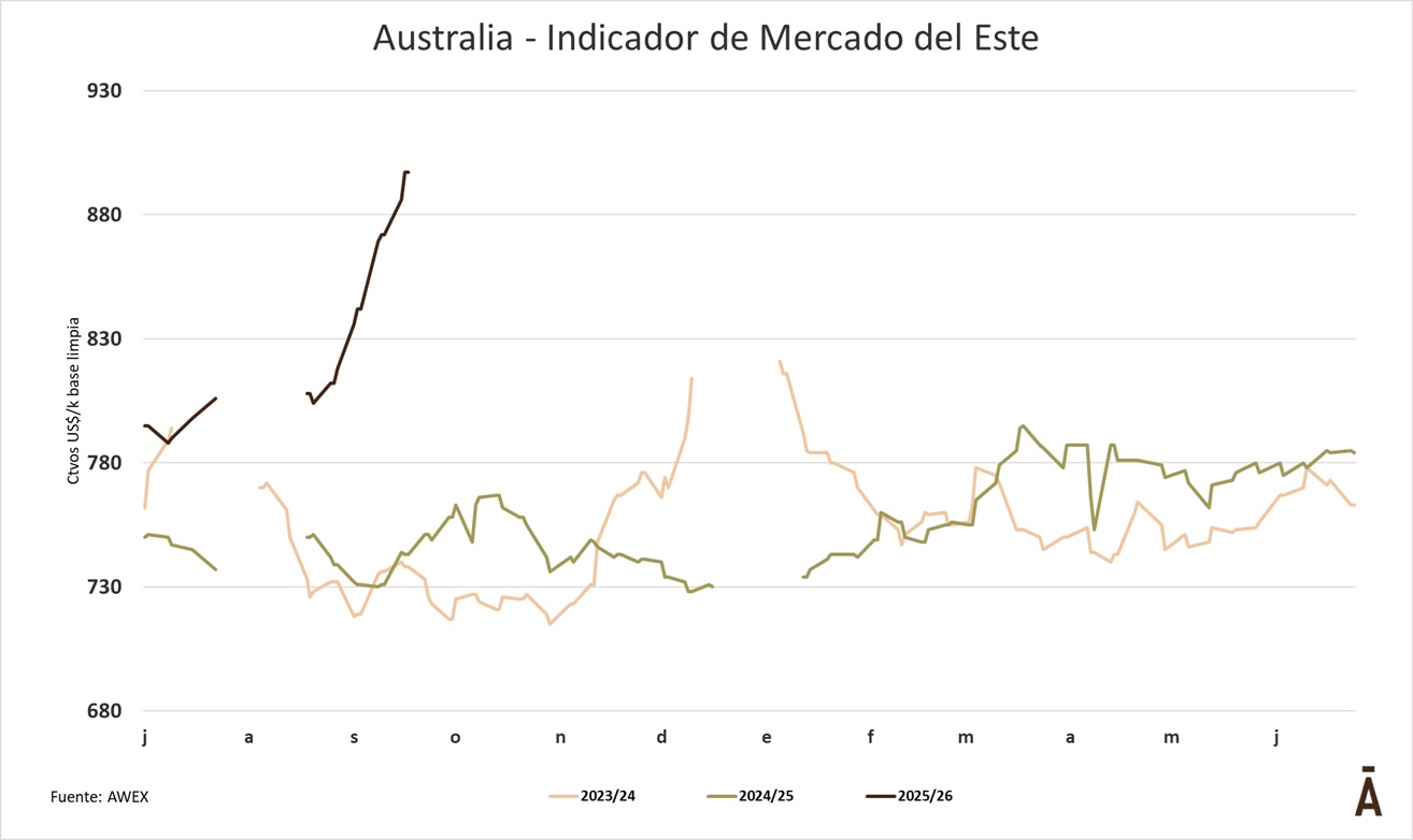 El Indicador del Mercado del Este (IME) culminó la semana del 26 de septiembre de 2025 con un repunte de precios sostenido e inusualmente fuerte. El IME cerró en A$ 14,53 por kilogramo base limpia, lo que se tradujo en US$ 9,61, considerando el tipo de cambio A$/US$ de 0,662. Este avance representó una ganancia semanal de A$ 1,09 y de 0,64 centavos estadounidenses.