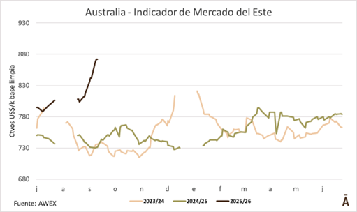 El mercado lanero australiano mantuvo su tendencia alcista y cerró la segunda semana de septiembre con un nuevo incremento del Indicador del Mercado del Este (IME), que se ubicó a A$ 13,19 centavos por kilo base limpia. Se trata del nivel más alto desde marzo de 2023 y confirma la recuperación más prolongada de los últimos seis años y medio, con ocho subas semanales consecutivas y un total de 14 sesiones positivas en línea, el período más largo desde 2011.