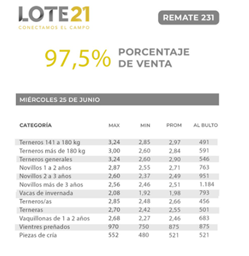 El consorcio Lote 21 cerró este miércoles su segundo remate de junio con un 97,5% de ventas.