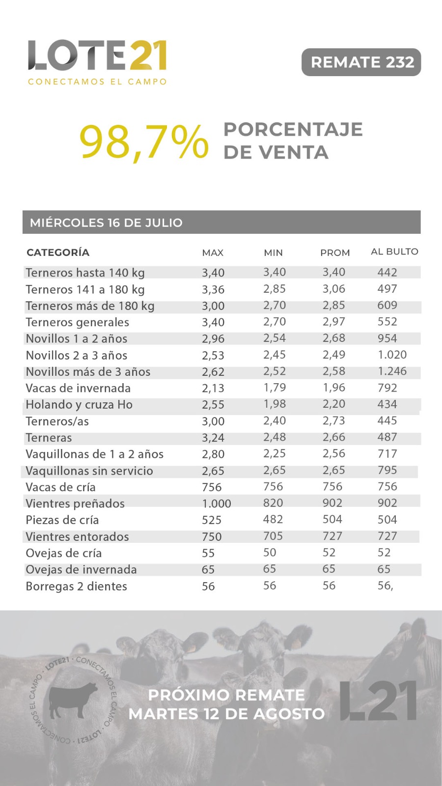 El consorcio Lote 21 tuvo este miércoles su remate 232 de julio con un 98,7% de ventas. Los terneros hicieron un promedio general de US$ 2,97 por kg en pie (US$ 552 al bulto), los novillos de 1 a 2 años US$ 2,68, y los de 2 a 3 años US$ 2,49. Las vacas de invernada por su lado hicieron US$ 1,96 (US$ 792 al bulto). La próxima actividad de Lote 21 será el martes 12 de agosto.