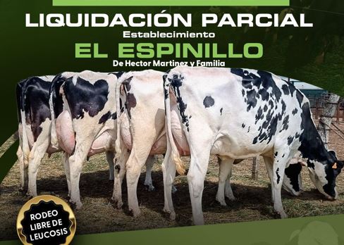 Este viernes 26 de septiembre, se llevará a cabo la liquidación parcial del establecimiento El Espinillo, de Héctor Martínez y familia, con una destacada oferta de 150 vacas y vaquillonas Holando SH, todas pertenecientes a un rodeo cerrado, libre de leucosis, con un promedio de 100 mil células somáticas y una producción de 32 litros diarios.