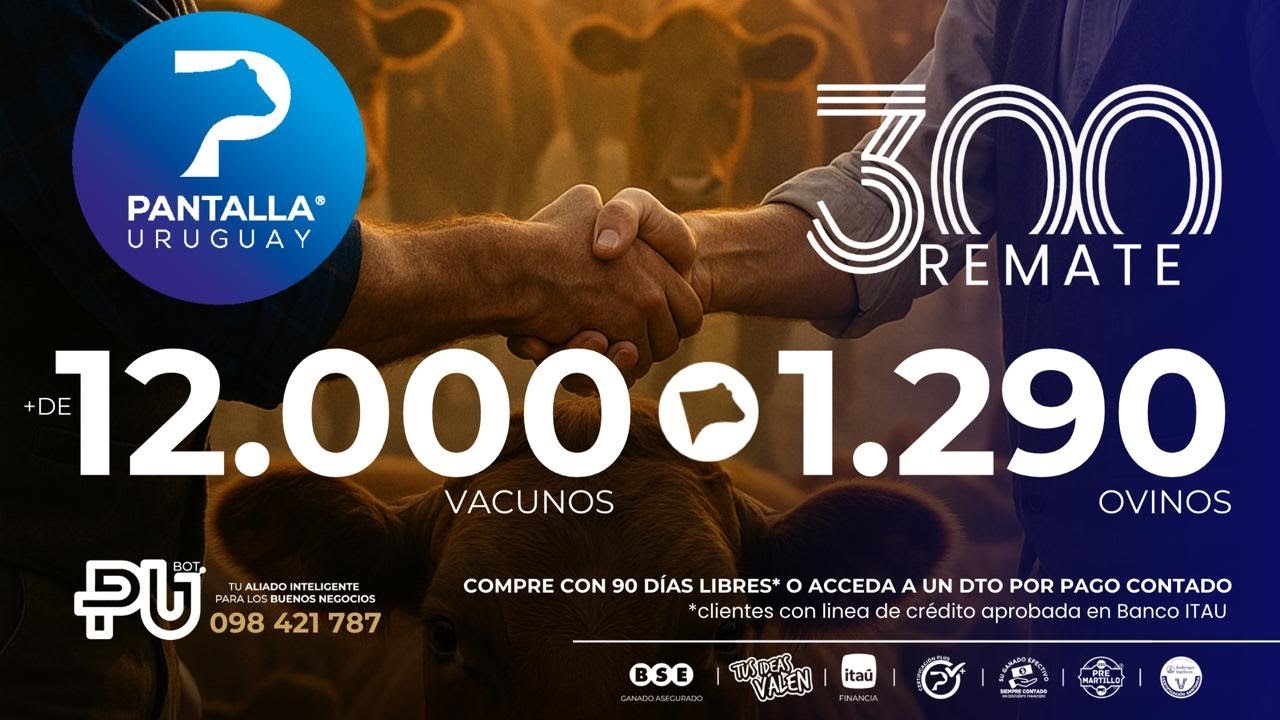 En su remate 300, el consorcio Pantalla Uruguay tuvo este jueves su primer día de actividad con una fluida colocación. Los terneros hicieron un promedio general de US$ 3,46 por kg en pie (US$ 646 al bulto), con un máximo de US$ US$ 4,10 para un lote de terneros livianos de menos de 180 kg. Respecto al remate anterior de agosto (US$ 3,26), los terneros se valorizaron 5,5%.