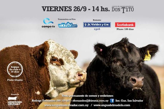 Este viernes 26 de septiembre, el escritorio Valdez llevará a cabo el 26° remate de Sociedad Ganadera San Salvador, destacando principalmente la fertilidad genética con marca registrada de sus reproductores y vientres, todos inmunizados.