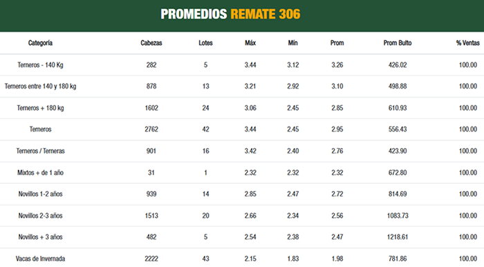 El consorcio Plaza Rural cerró este jueves su primer día de actividad del remate 306 con un 100% de ventas en todas las categorías, con un mercado de reposición que mostró un fuerte dinamismo en su comercialización. Los 2.762 terneros hicieron un promedio de US$ 2,95 por kg en pie (US$ 556 al bulto). En el remate anterior de mayo, el promedio había sido de US$ 2,97 por kg en pie, pero el bulto fue más bajo (US$ 525).