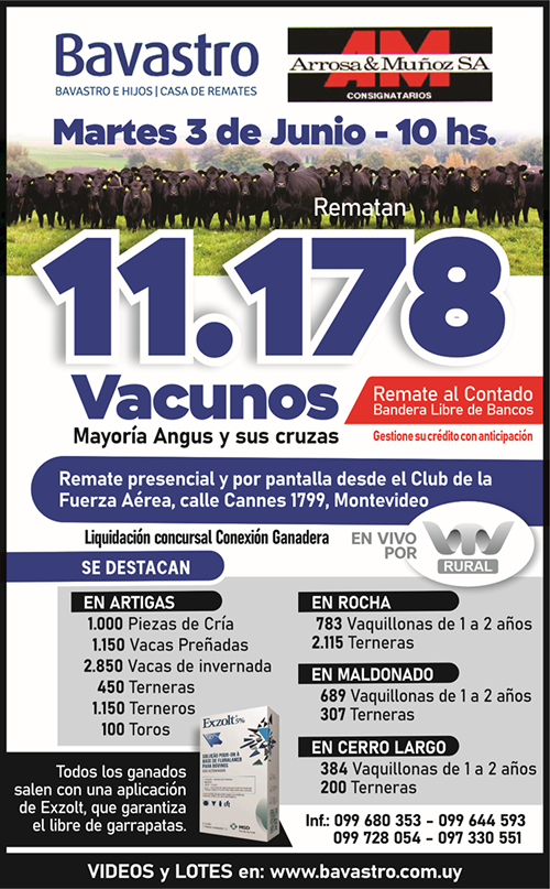 Bajo el martillo de Bavastro e Hijos y el escritorio Arrosa & Muñoz SA, el próximo martes 3 de junio, desde la hora 10, se realizará una liquidación concursal con parte de los activos de Conexión Ganadera. El remate contará con una oferta de 11.178 vacunos, mayoría Angus y sus cruzas. La liquidación se realizará desde el Club de la Fuerza Aérea y se transmitirá por la pantalla de VTV Rural.